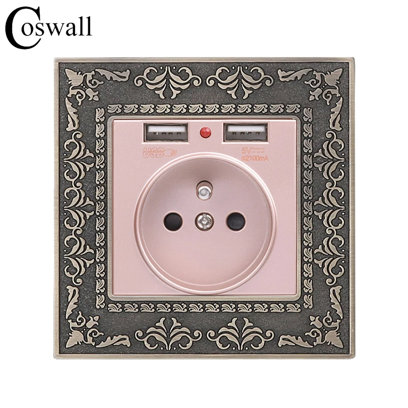 Beste Kopen Coswall Zinklegering High end Retro 16A Goud Franse Standaard Power Stopcontact Met Dual USB 2.1A Poort Opladen reli euml;f Panel Goedkoop.