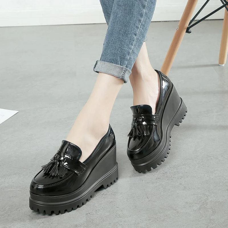 Goede Kopen MCCKLE Herfst Vrouwen Klimplanten Platform Toevallige Hoge Hakken Kwasten Vrouwelijke Schoenen Lakleer Wig Schoenen Dames Slip Op Schoen Goedkoop