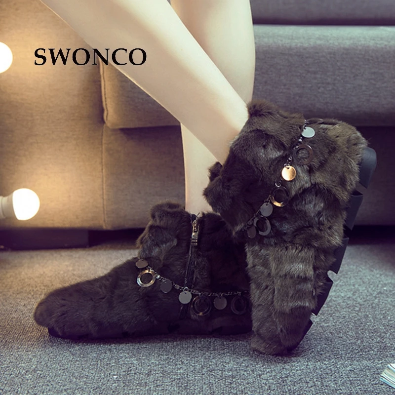 Goede Koop SWONCO vrouwen Enkellaarsjes 2018 Winter Luxe Bont Sneeuw Boot Schoenen Vrouw Laarzen Winter Mode Ketting Warm Vrouw enkellaars Goedkoop.