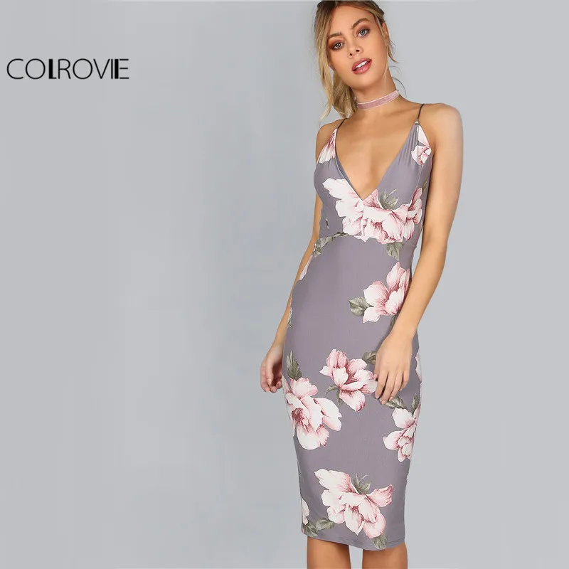 Goede Kopen COLROVIE Bodycon Party Dress Vrouwen Grijs Bloemen Sexy Backless Slip Zomer Jurken Mode Plunge Hals Elegante Midi Jurk Goedkoop.