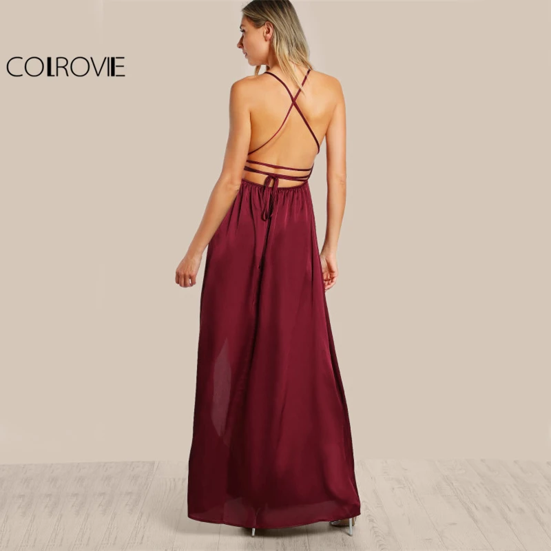 Beste Koop COLROVIE Hoge Split Wrap Satijnen Maxi Jurk Plunge Hals Kruis Terug Vrouwen Sexy Gedrapeerde Lange Jurken Mouwloze EEN Lijn Slip jurk Goedkoop