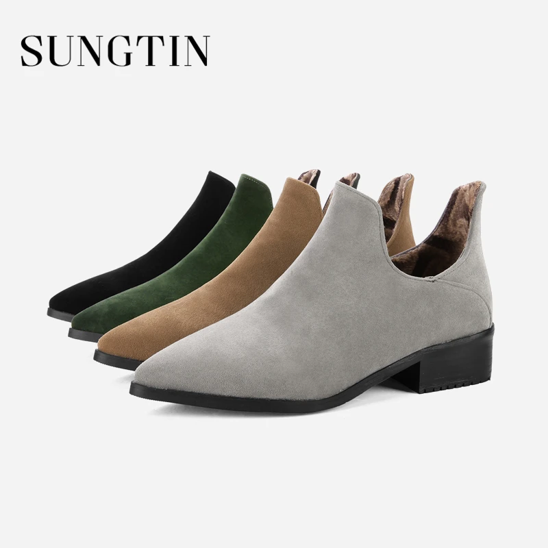 Beste Koop Sungtin 2018 Klassieke Ontwerp Faux Suede Chelsea Laarzen Vrouwen Mid Hakken Sexy Puntschoen Slip Enkellaars Dame Booties Big Size Goedkoop