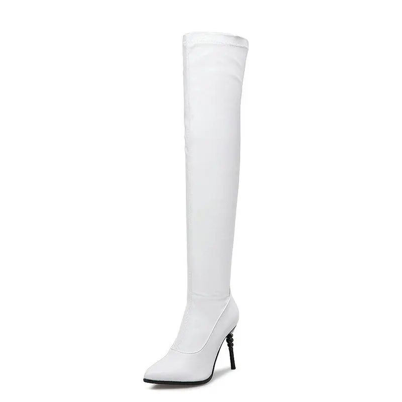Beste Koop Vrouwen Sexy Stretch PU Dunne Hoge Hak Over de Knie Laarzen Mode Slip Op Wees Teen Fall Winter Dij Laarzen zwart Rood Wit Goedkoop.