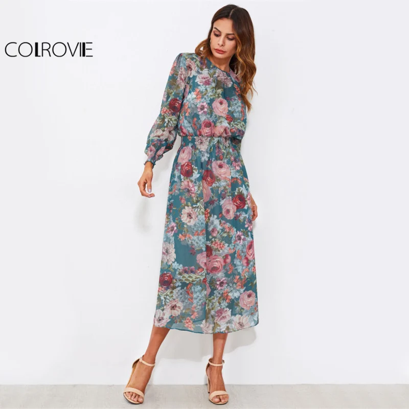 Goede Koop COLROVIE Bloemen Shirred Taille Chiffon Jurk Met Liner Slip Jurken Fall 2017 Fashion Vrouwen Elegante Lange Mouwen Blauw Midi Jurk Goedkoop.