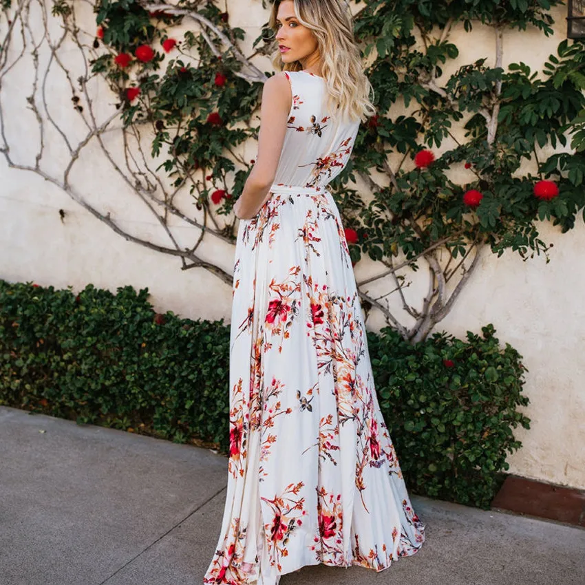Beste Kopen Sexy Vrouwen Maxi Boho wit Jurk Bloemenprint Mouwloze Zomerjurk 2018 Vakantie Lange Slip Strand Zonnejurk Vestidos Streetwear Goedkoop